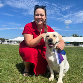 Truffle is a lovely addition to our program and has had both success winning at All Breed Shows and grabbing the eyes of judges at Specialties as well. She lights up when she is showing and moves beautifully around the ring. She has earned her Championship, her first Major win towards her Grand Champion title, her Certified Good Citizen title, Trick Dog title and Fetch Novice thus far. Truffle is loved by all that she meets and will lock eyes with those around her to draw them in to pet her. She is truly a joy to have in our home as a companion and has continued to impress us with what she achieves when we put a new task in front of her. She comes to us from Gunpowder & Lead Labradors.